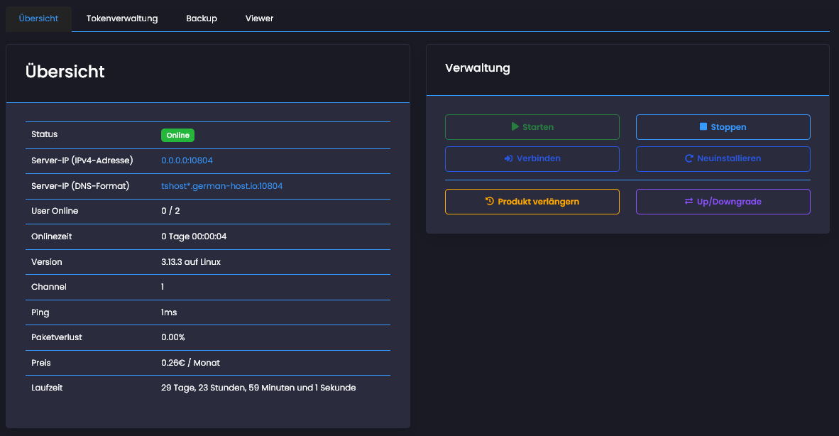 Die Produktübersicht bietet dir ein einwandfreies Handling von Steuerungen oder One-Klick Lösungen. Somit ist die Verwaltung deines Servers einfach und schnell möglich.